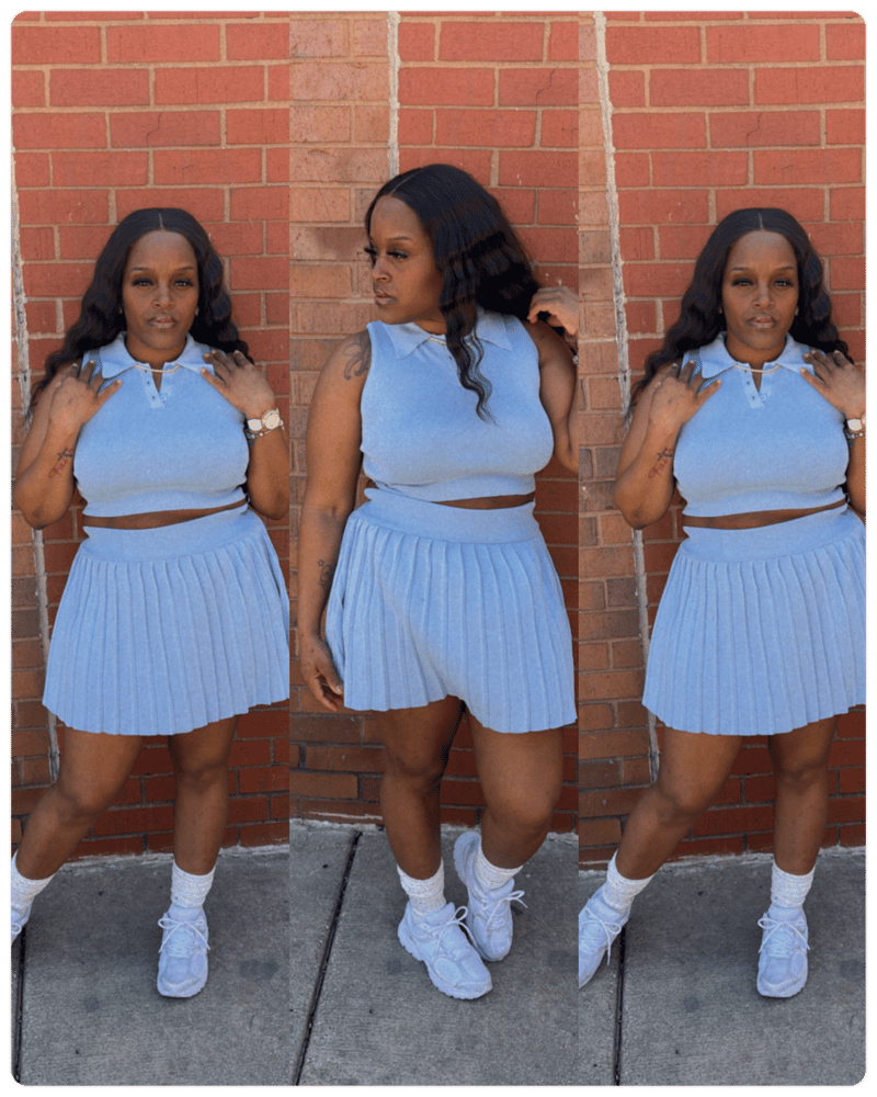 Two piece knit skirt set. Sleeveless collared button up crop top with matching pleated tennis skirt
